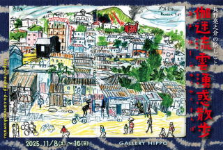 11月8日(土) からは、長野亮之介さんの作品展です。 絵師啓白・・・市場の立つ日は路地に屋台がひしめき、赤土の未舗装路は途端に狭くなって、人々でごった返す。値段交渉をする人たちの言葉はフランス語か、はたまた国内に250もあるという部族語だろうか。景気づけに鳴らす音楽が幾重にも重なる。人混みに手押し車を割り込ませながら拡声器で惹句を繰り返す売り子の横を、バイクタクシーが警笛を鳴らしながらすり抜ける。喧騒から離れようと坂道を登ると、子どもたちがマンゴーの木に登って器用に果実を落としていた。色鮮やかなトカゲやさまざまな鳥たちの姿も見える。アフリカ中央部のカメルーン西部州。チャンという町を今年2度訪れた。あてどなく散歩しては出会う風景や人々。その印象を絵にしてみました。